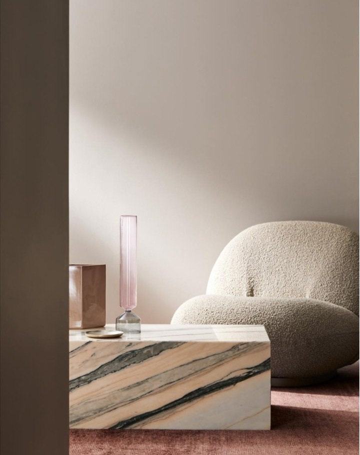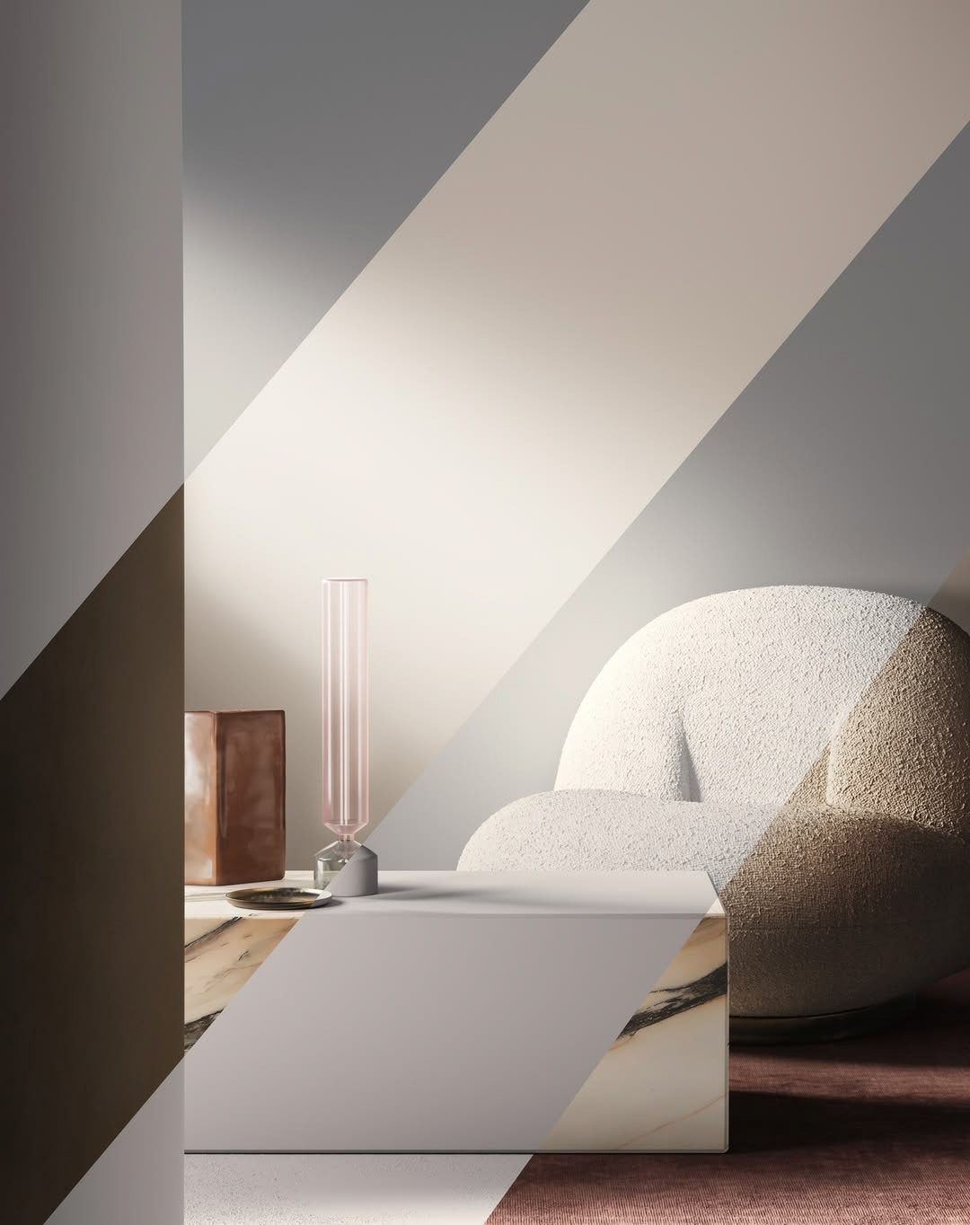 A simple life of mine. I was reading a poetry book from 1945 which I picked from a old bookstore. As the poetry grew into an inspiration, I retreated into light, texture, and restraint. Studying Lillie and Bek’s work taught me that true elegance doesn’t shout it invites you closer. I spent hours adjusting the way light kissed the pink glass flute, how the marble’s veins caught the glow, how the bouclé held shadows like velvet secrets.